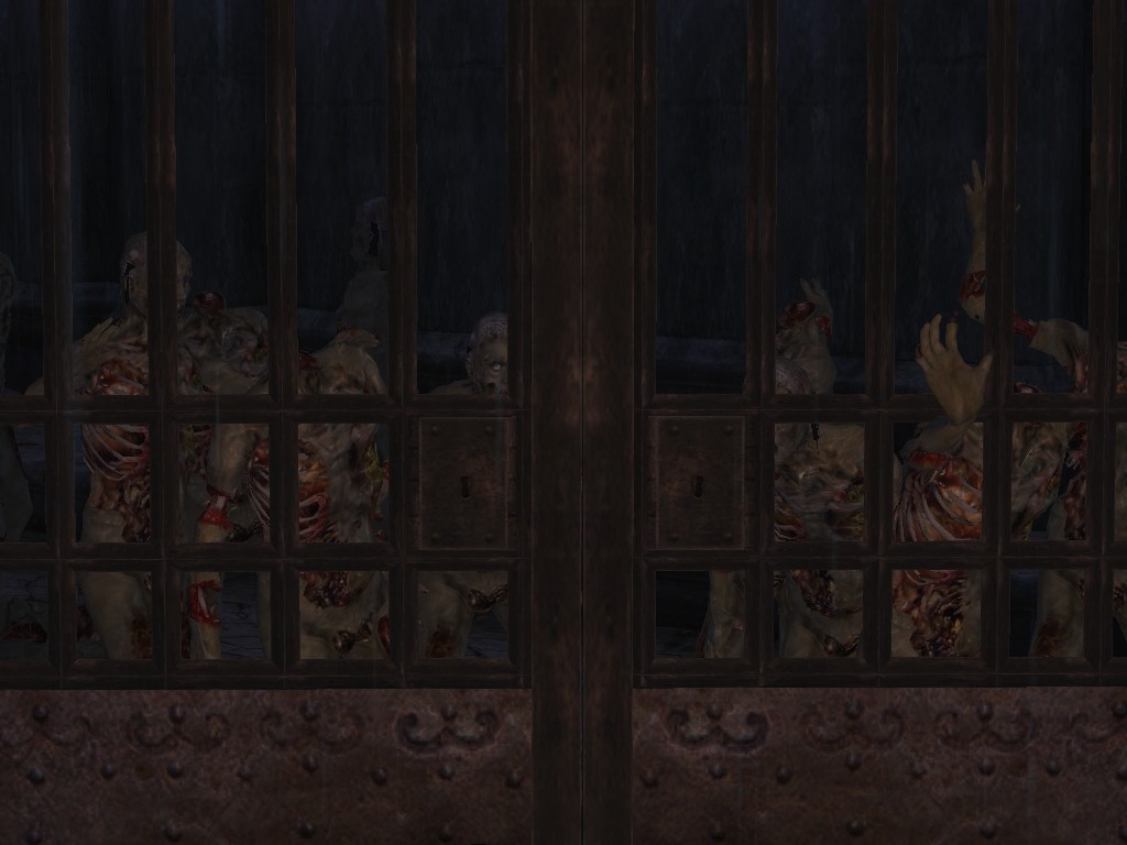 ■わらわらと登場するゾンビたちは特にMODを使用している訳ではなく、コンソールからplayer.placeatmeで呼び出したものです。オブのゾンビは相当にグロテスクなので大量に配置するとそれだけで雰囲気が出ます。